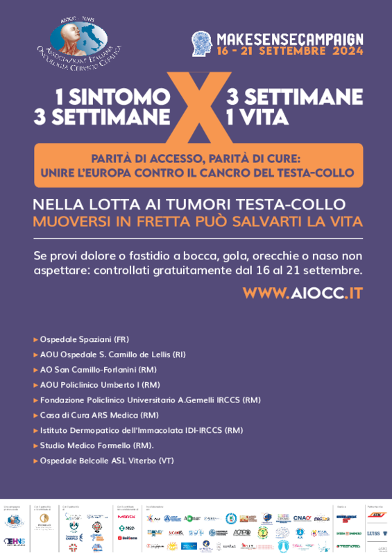 1 sintomo per 3 settimane, 3 settimane per 1 vita: è il motto dell’edizione italiana della Make Sense Campaign 2024, la Campagna europea di educazione e sensibilizzazione alla prevenzione dei tumori del distretto testa-collo che quest’anno tornerà dal 16 al 21 settembre. Promossa in Italia dall’Associazione Italiana di Oncologia Cervico-Cefalica (AIOCC), all’iniziativa aderiranno oltre 130 Centri che, in quella settimana in tutta Italia, organizzeranno giornate di diagnosi precoce gratuite.