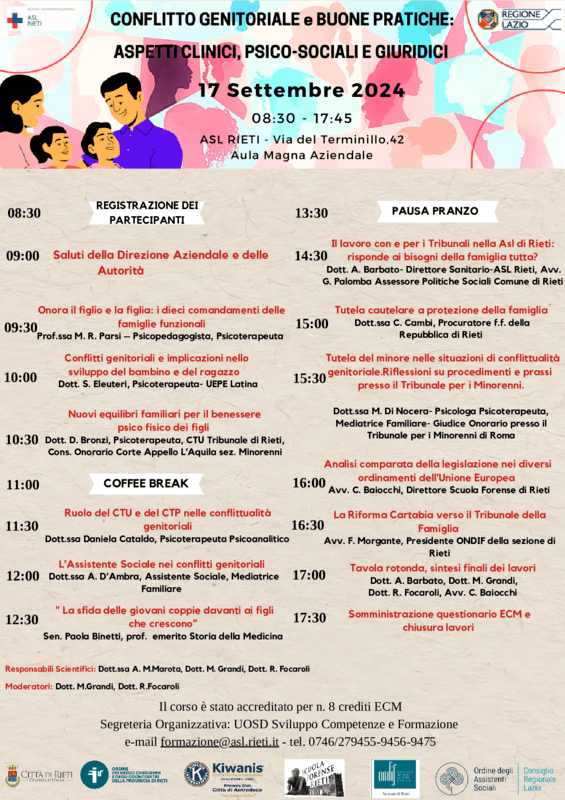 Si terrà in data 17.09.2024, presso l’Aula Magna Aziendale, in Via del Terminillo n. 42, Blocco 2, il convegno “Conflitto Genitoriale e Buone Pratiche: Aspetti Clinici, Psico-Sociali e Giuridici”.