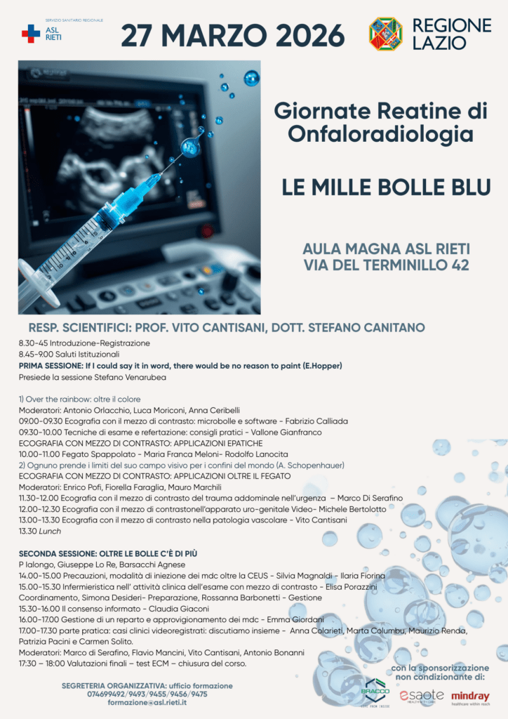 Si terrà nella giornata di venerdì 27.03.2026, presso l’Aula Magna della ASL Rieti, l’evento denominato “Giornate Reatine di Onfaloradiologia – Le Mille Bolle Blu”, con l’obiettivo di fornire un aggiornamento multidisciplinare e pratico sull’impiego dell’ecografia con mezzo di contrasto (CEUS) che ha rivoluzionato l’approccio diagnostico per immagini, superando i limiti intrinseci dell’ecografia B-mode e Color-Doppler. Grazie all’impiego di microbolle di seconda generazione, questa metodica permette uno studio dinamico e in tempo reale della macro e micro-vascolarizzazione tissutale, con un profilo di sicurezza elevato e l’assenza di radiazioni ionizzanti o nefrotossicità.