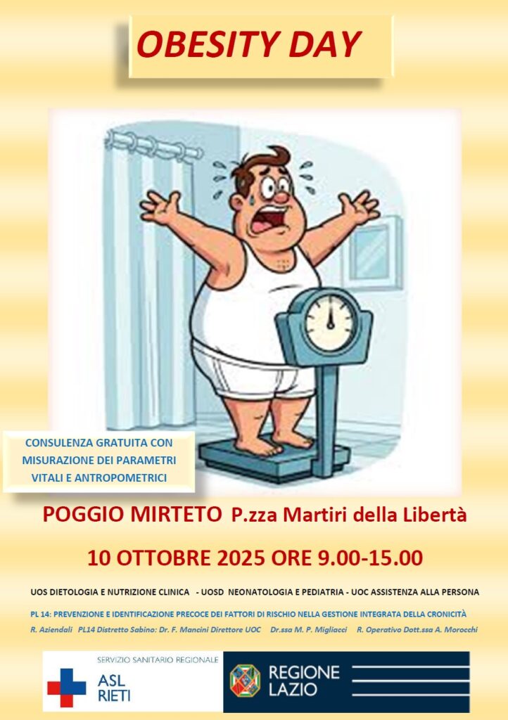 In occasione della giornata nazionale “Obesity Day“, venerdì10/10/2025 la ASL Rieti organizza una specifica iniziativa di counseling che si svolgerà a Poggio Mirteto, in Piazza Martiri della Libertà, dalle ore 9.00 alle ore 15.00, grazie alla collaborazione tra il Servizio di Nutrizione Clinica, l’Unità di Pediatria e l’Unità Gestione Personale di Assistenza dell’Azienda. Una mattinata di colloqui informativi gratuiti dedicati alla promozione di sani stili di vita finalizzati a prevenire il sovrappeso e l’obesità nella popolazione.