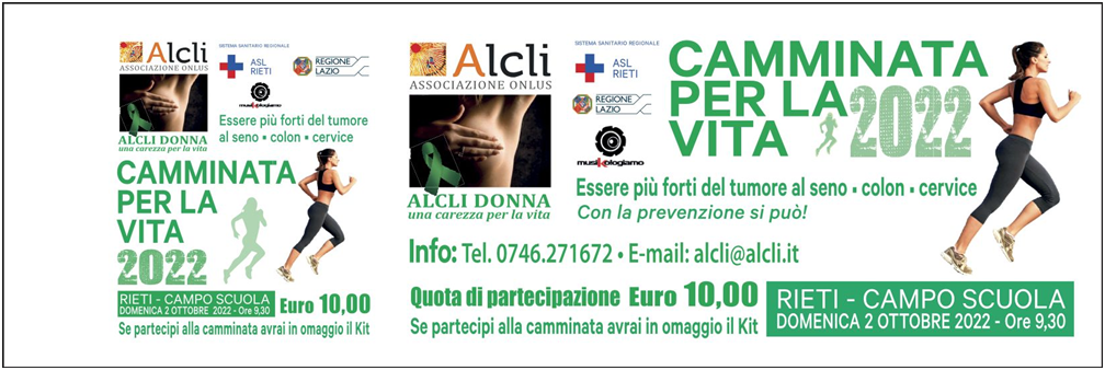 02 Ottobre 2022 – “Camminata per la Vita” iniziativa promossa Alcli Giorgio e Silvia attraverso il gruppo “ Alcli Donna “ in collaborazione con la ASL di Rieti e la LILT dal titolo la “Camminata per la vita” presso il Campo Scuola Raul Guidobaldi di Rieti Domenica 2 ottobre ore 09.30. Sarà possibile prenotarsi per Screening gratuiti messi a disposizioni dalla Asl di Rieti. L’ evento è aperto a tutti i cittadini, alle Associazioni di volontariato, ai gruppi musicali, ai gruppi sportivi alle scuole.